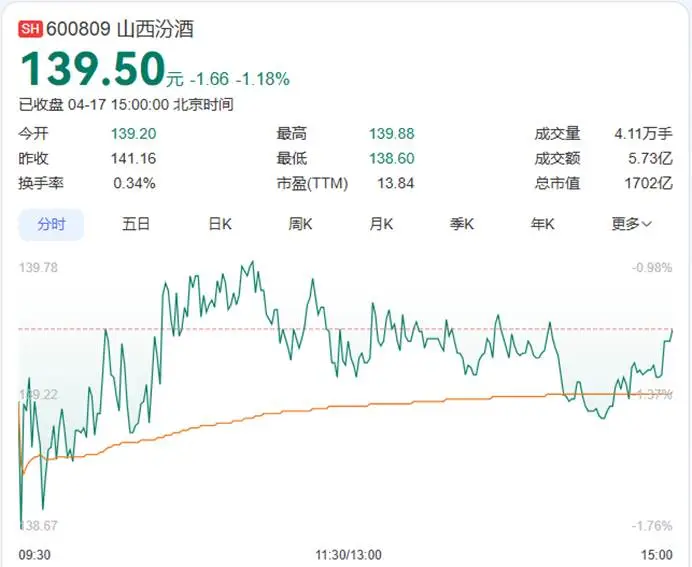 山西汾酒最近在资本市场上表现不佳,股价和市值都有所下降。到2026年4月17日收盘时,山西汾酒总市值为1702亿元,股价报收于139.50元,出现明显的回调迹象,相比巅峰时期4300多亿元的市值,已蒸发超过2500亿元,市值缩水超过六成。