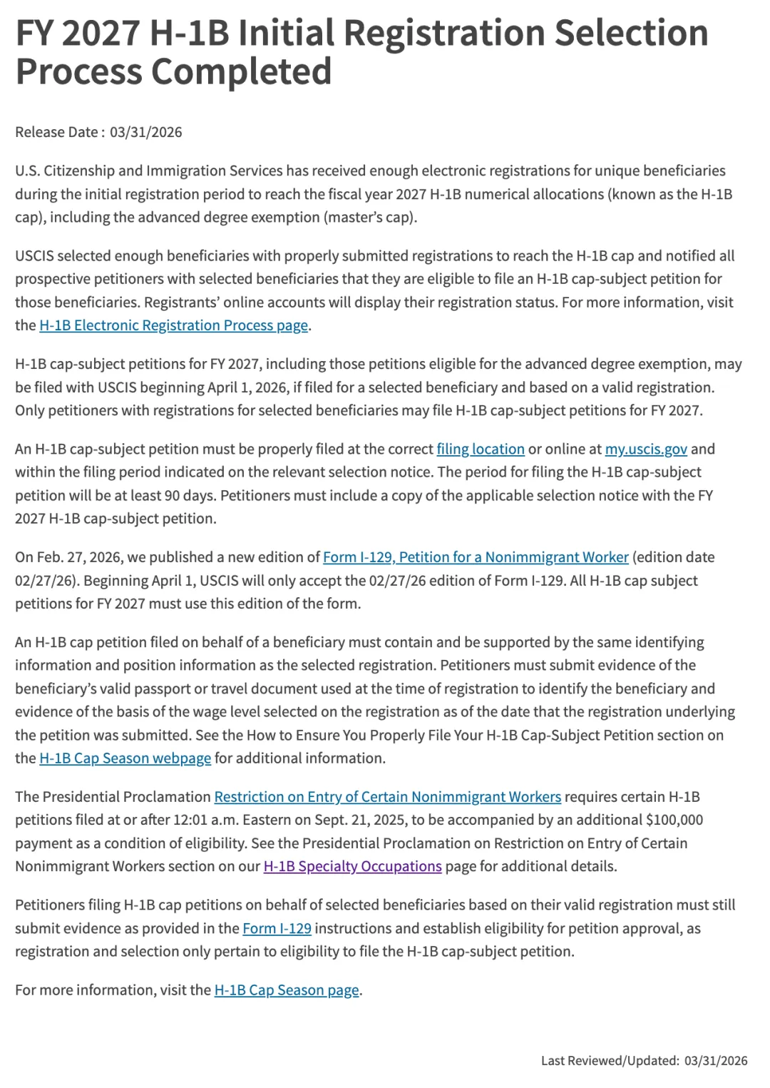 当地时间3月31日下午5点,美国移民局公布了2027财年H-1B抽签最新进展: