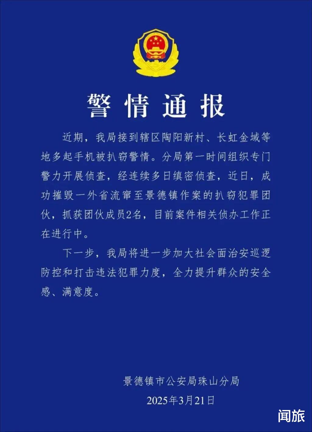 第二天,景德镇警方发布通报,确认摧毁了一个外省流窜扒窃团伙,抓获2名嫌疑人。