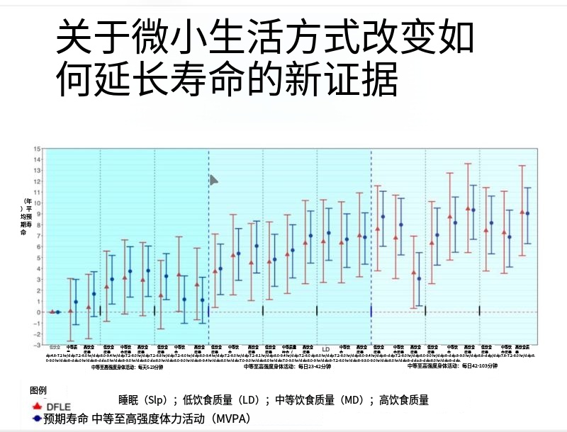 最震撼的结论来了: 只需要每天多睡5分钟、多中高强度运动1.9分钟、饮食质量分数(DQS)提高5分(相当于多吃半份蔬菜或1.5份全谷物),就能多获得1年寿命!