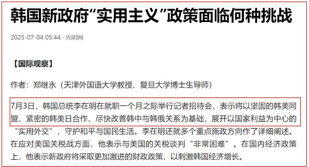 7月份,韩国总统李在明在青瓦台记者会上又宣称:将以坚固的韩美同盟、紧密的韩美日合作作为基石,推进“实用外交” 。这已经不仅仅是把咱们定性为竞争对手,而是要联合起来遏制我们的发展。