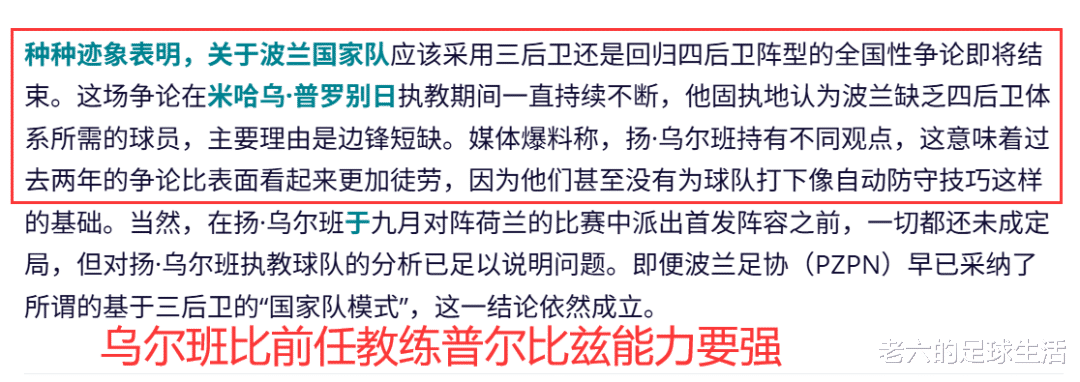 他刚上任的时候前任主教练普罗比兹提醒他波兰缺乏四后卫体系所需的球员,告诫他应该踢三后卫体系,而乌尔班不这么认为,与芬兰3-1的比赛就派出了四后卫体系,打了普罗比兹的脸。