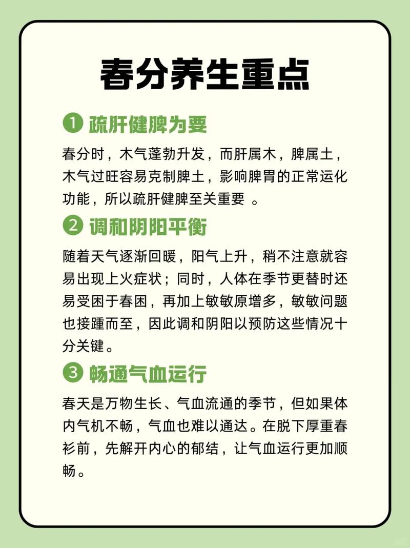 春分作为二十四节气的重要节点,太阳黄经达0°,恰逢春季正中,昼夜均分、寒暑平衡,自然万物进入“阳生阴长、寒热相半”的关键阶段。此时人体气血津液随春阳升发趋于活跃,却因气温波动、湿气渐生,易出现阴阳失衡、脾胃不和、肝气偏亢等问题。春分后养生的核心是“顺时调衡”,以养阳护脾、疏肝祛湿、平和情志为重点,顺应春生之性调和脏腑机能,为全年健康筑牢基础,具体注意事项如下。