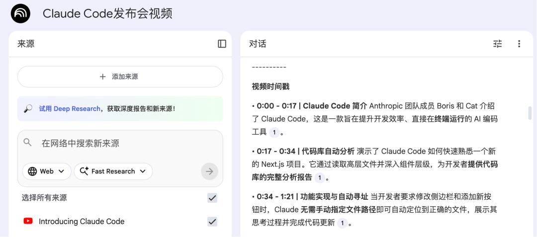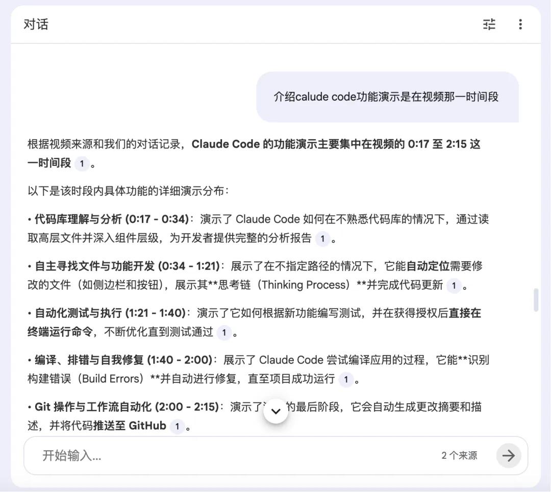 也就是说YouTube视频的任何进度条和颗粒度,你都可以问NotebookLM,比如我贴进去Claude Code的产品发布视频链接,然后问它“Claude Code功能演示是在哪一时间段”,它就会把每个功能演示的时间戳列出来,并配上文字概要。