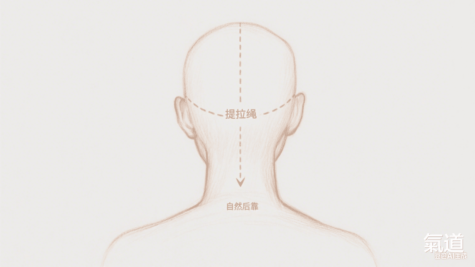 意念想 “头顶有根细线轻轻往上提”,后脑勺自然后靠,额头舒展。