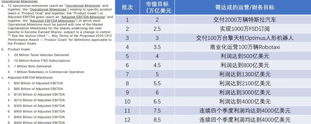 马斯克的新对赌协议设置了12个运营里程碑,每个必须同时满足市值和运营双重指标。运营指标分为产品目标和财务目标产品层面要求累计交付2000万辆车、1000万FSD订阅用户、100万台Optimus机器人和100万辆Robotaxi商业化运营。财务层面要求调整后EBITDA从500亿美元阶梯式增长至4000亿美元,最高档连续三次锁定在4000亿美元关卡。