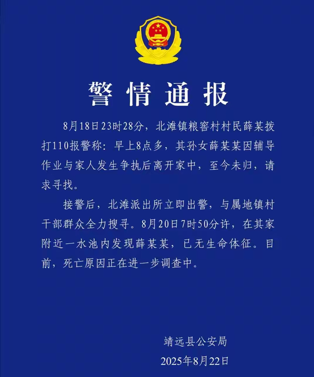 今天靖远县公安局发布了警情通报,女孩因为辅导作业与家人发生争执后离家,经全力搜索,在家附近水池中发现女孩的遗体!