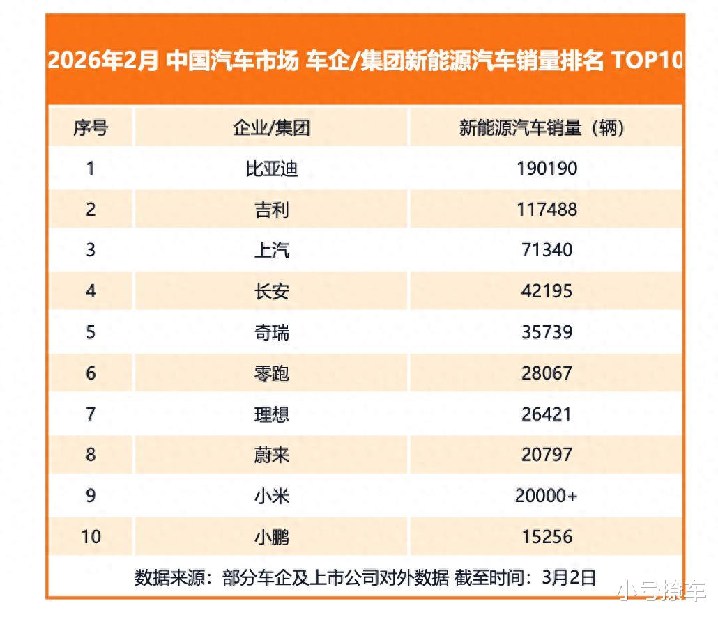 2026年开局,中国新能源汽车市场竞争格局进一步明朗。根据各车企及上市公司对外披露的数据,比亚迪集团2月新能源汽车销量达190190辆,再度位居行业首位,在主流车企中持续保持明显领先优势,以稳定而强劲的表现巩固头部地位。