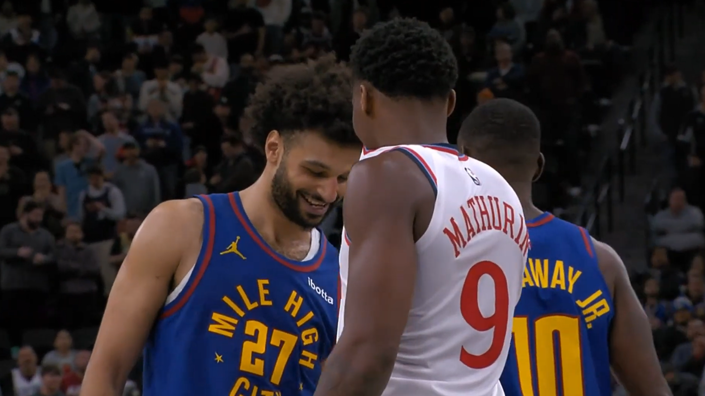 ——剩下5分35秒前,45度面对卡梅伦约翰逊,借挡拆一个假变向,一步过了对手,然后将约基奇也甩在了身后,完成一记突破扣篮