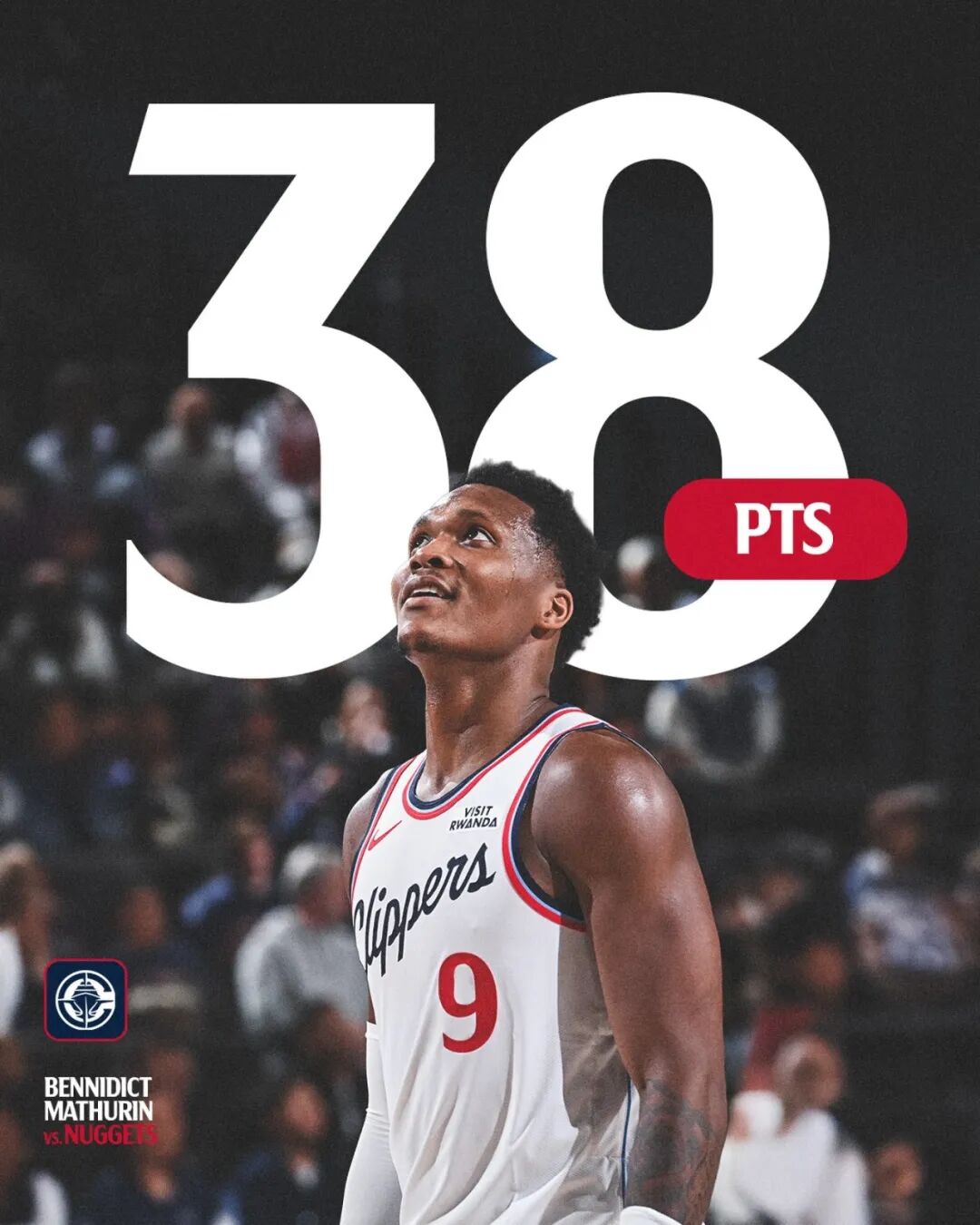 这场比赛,快船新援马瑟林迎来了主场首秀,然后打出了相当炸裂的表现:替补出战34分钟,投篮22中12,三分6中2,罚球13中12,得到38分5篮板4助攻3抢断。
