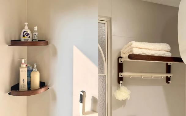 而卫生间的墙壁空间也比较大,可以后期去放不锈钢置物架,采用免打孔的方式,能直接粘在墙壁中,将经常用到的物品都放在上面,拿取也顺手。