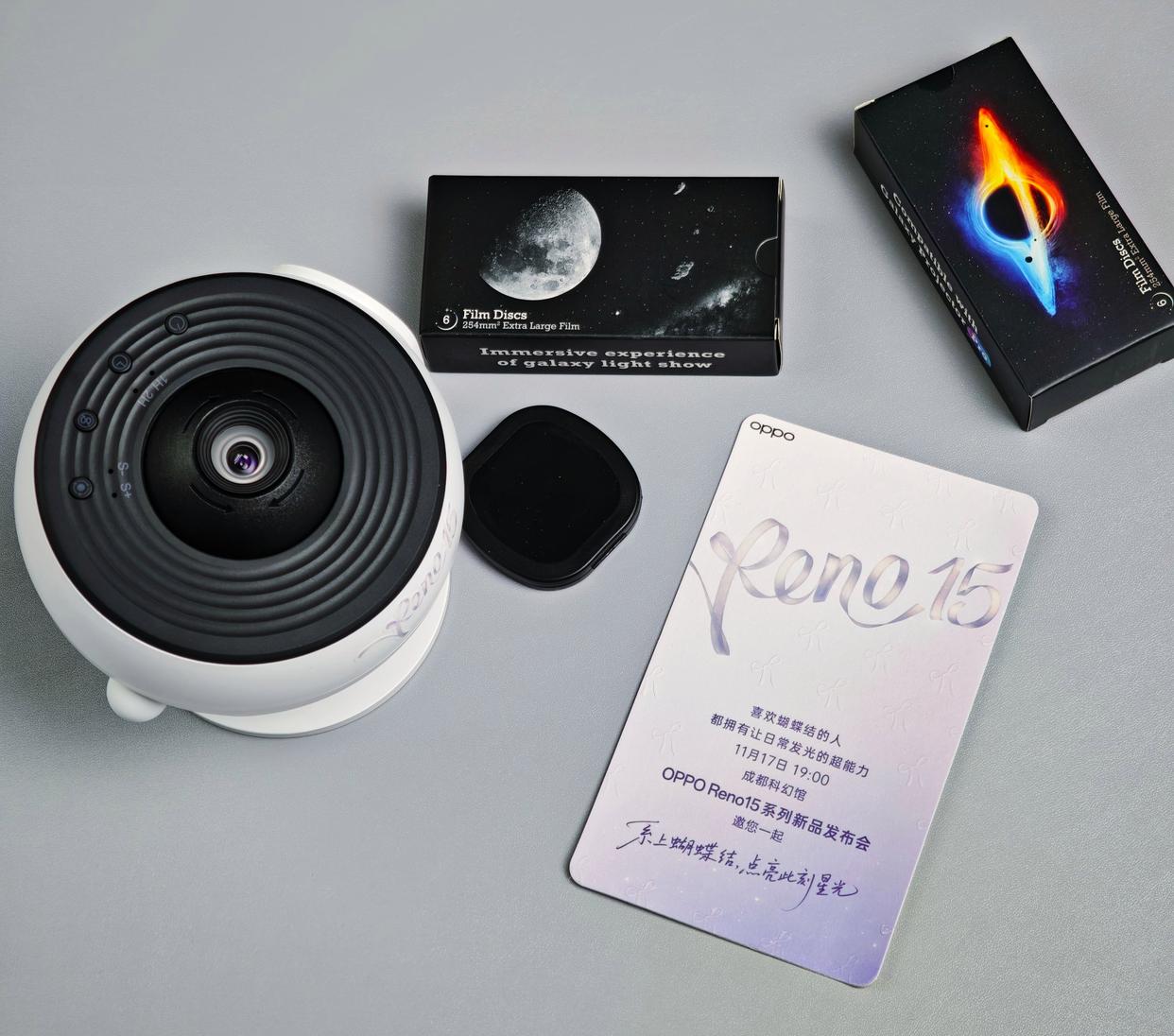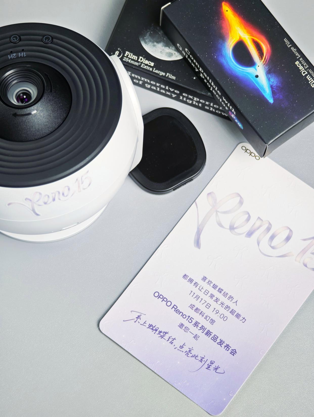 另外,日前,OPPO Reno15系列的实物邀请函也正式亮相,此次邀请函中,除了引人注目的定制星空投影灯和独具匠心的13款不同风格的图案灯片之外,包装盒和邀请卡上的“星光蝴蝶结”元素,完美诠释了“系上蝴蝶结,点亮此刻星光”的设计理念。