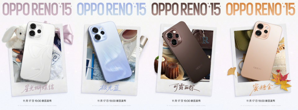 在近日的官宣预热中,官方还陆续展示了OPPO Reno15系列的外观和配色亮点。据官方称,“收藏一枚浪漫的「星光蝴蝶结」捕捉一片灵动的「极光蓝」品尝一口美味的「可露丽棕」定格一抹温柔的「蜜糖金」#OPPO Reno15#系列全新配色,拿捏秋冬氛围感”“窄至1.15mm,窄到离谱!极窄四等边直屏,正脸精致到没边 无边沉浸视野,追剧体验拉满”。