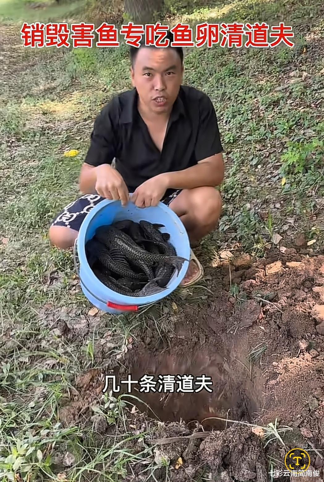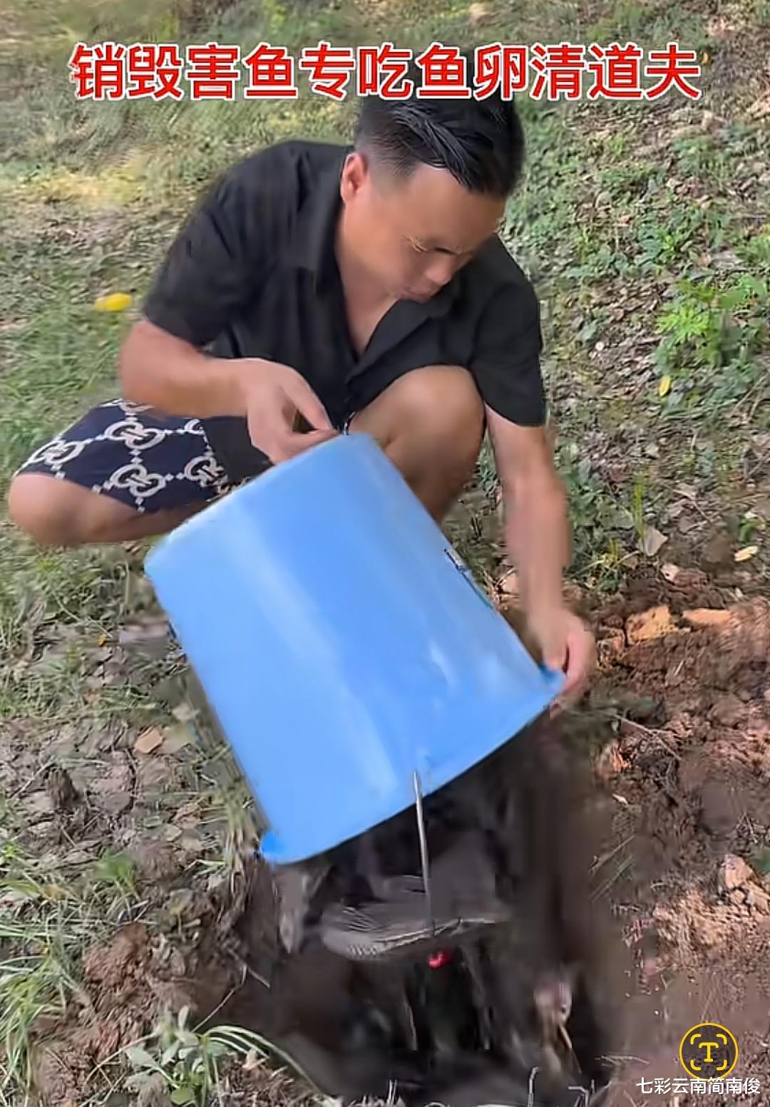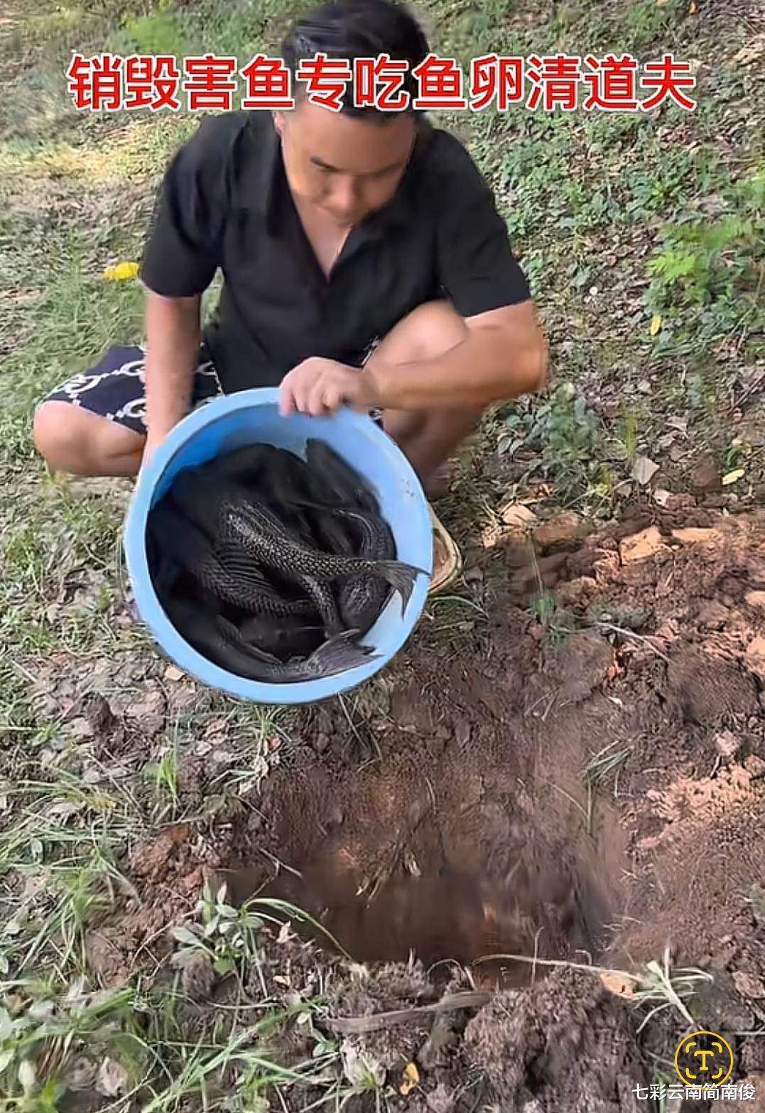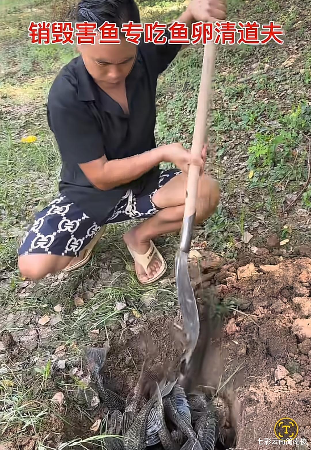 随即,广东省广州市南沙区男子用铁铲在地上挖了一个坑,将桶中的清道夫鱼倒入坑中活埋,令人联想到“小猫种鱼”的场景,与此情此景,十分吻合。