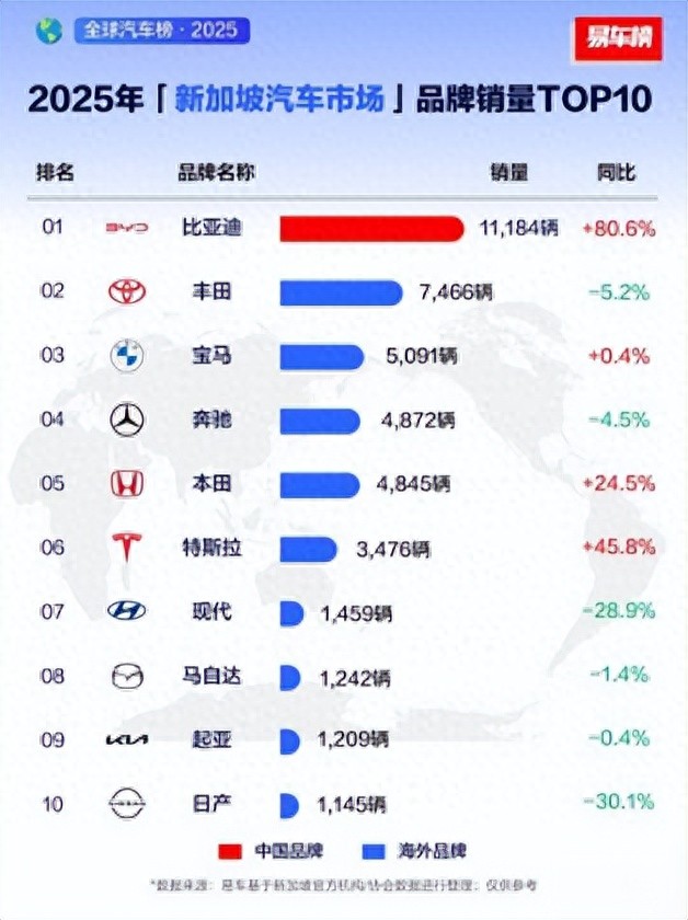 提起全球化出海,比亚迪最近在新加坡交出了一份堪称“统治级”的成绩单。根据新加坡陆路交通管理局的最新数据,在2025年,比亚迪乘用车在当地砍下了11184辆的销售成绩,同比暴涨80.6%,毫无悬念地蝉联了全品牌年度销量冠军 。