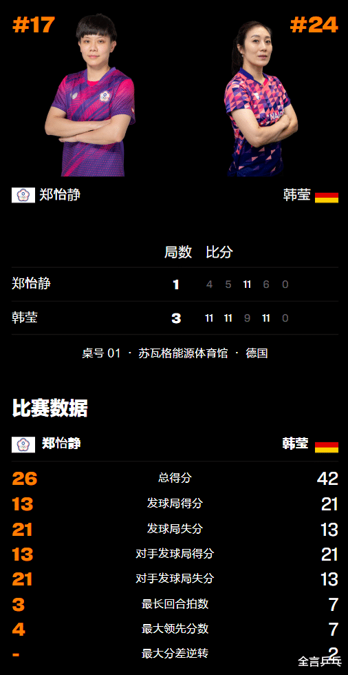比赛开始后,韩莹在首局迅速进入状态,再次发挥出了自己的打法优势并取得绝对领先的位置,其削球旋转变化让对方失误连连,郑怡静基本找不到太多赢球的办法,很快便被对方拿到多达6个局点,紧接着再丢1分以4-11惨败。