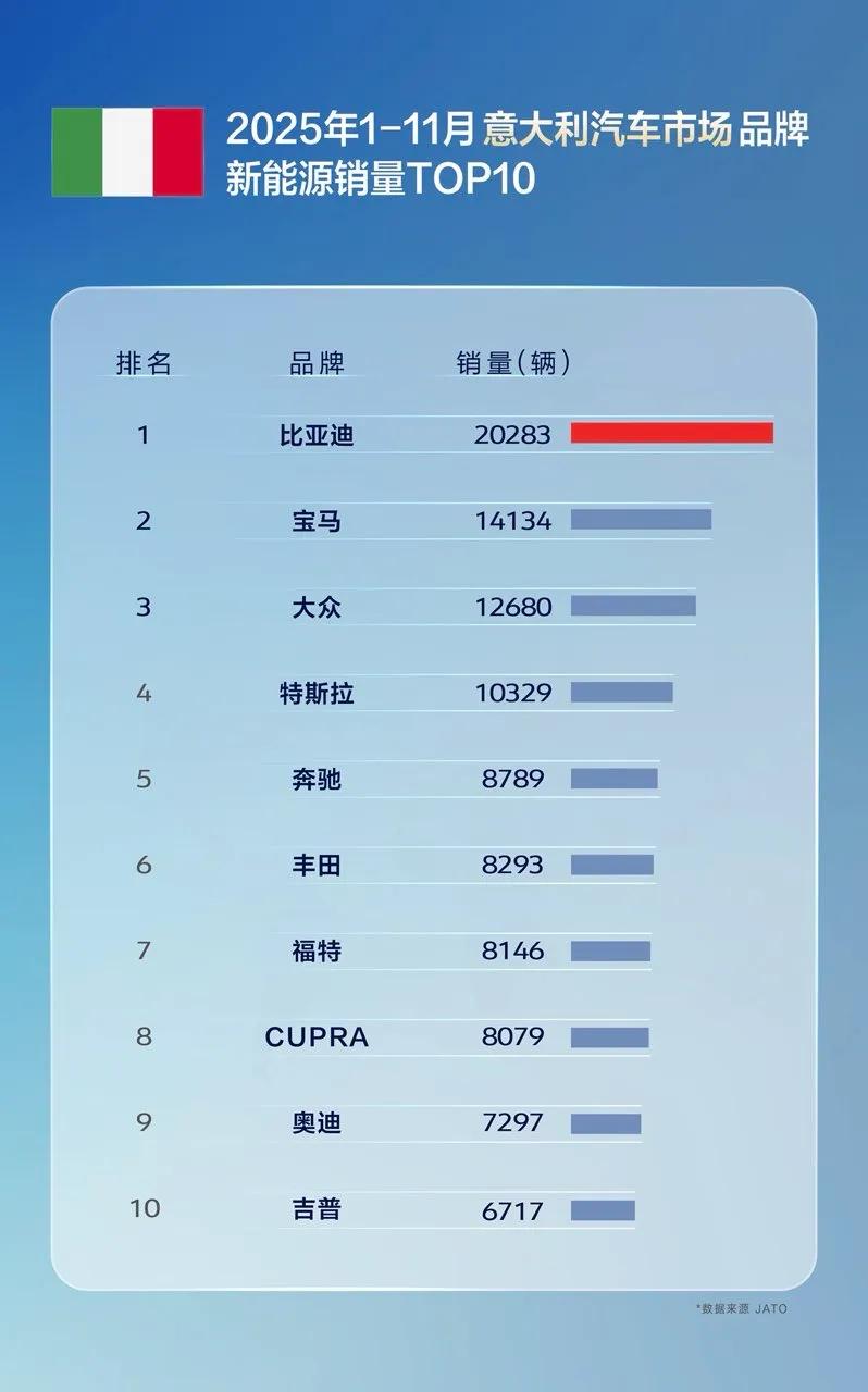 当我们深入了解时就会发现11月比亚迪多国销冠全面超越,如意大利、土耳其、西班牙、匈牙利等11个国家比亚迪均取得了销冠。甚至在一些发达国家的新能源汽车市场比亚迪汽车的销量已远远超过了特斯拉。如下图所示意大利新能源汽车市场销量排行,比亚迪11月销量位列榜首超过了宝马、大众以及特斯拉等一众全球知名汽车大厂。