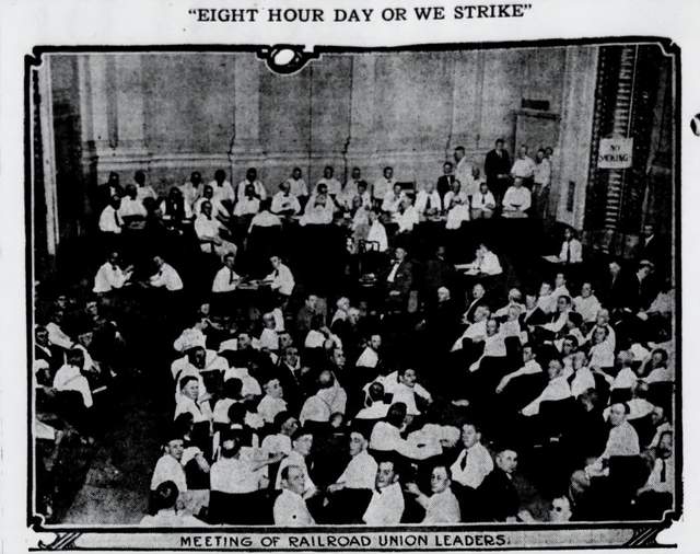 1916年,美国联邦政府通过了亚当森法案,为州际铁路工人建立了八小时工作制,这主要是由于工会的压力和担心美国即将进入第一次世界大战时铁路网络会瘫痪。