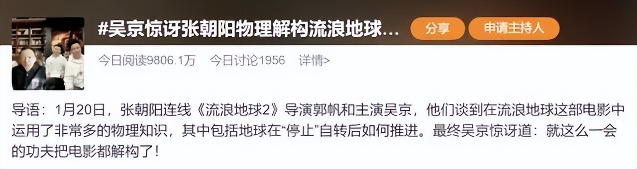 年初,他在连线郭帆和吴京时,使用洛希极限,解读地球如何被月球“撕碎”,让网友更懂《流浪地球2》的雄浑和悲壮。