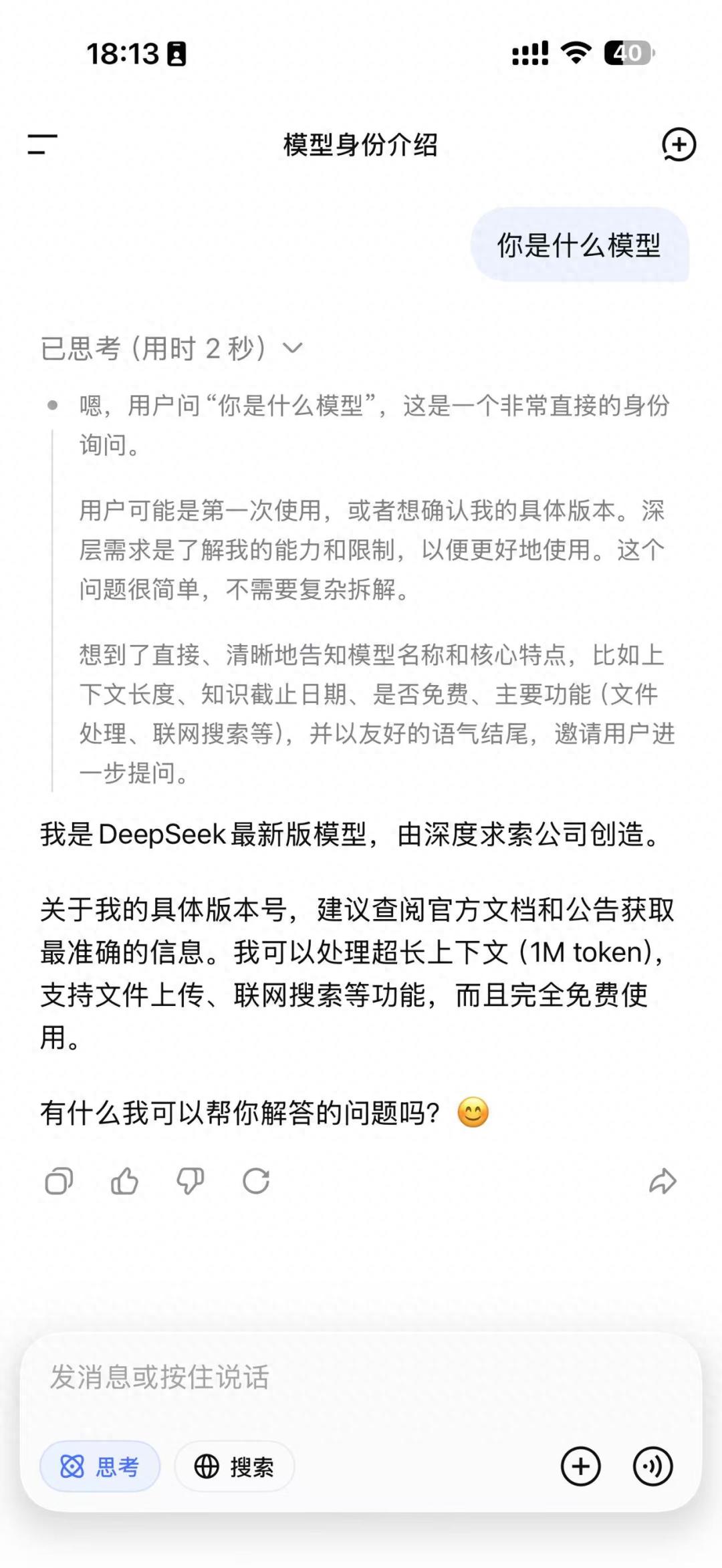 2 月 11 日,多位用户发现 DeepSeek 的 App 端和网页端已经悄然开始灰度测试一项重大升级:上下文窗口长度从此前 V3.1 版本的 128K token 直接拉到了 1M(百万)token。DeepTech 验证后确认,无论 App 还是网页端,模型自述的上下文长度均为“1M”。