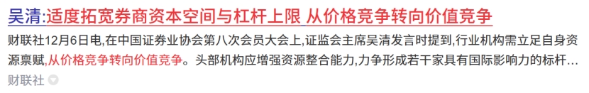 12月6日,在中国证券业协会第八次会员大会上,证监会主席表示,适度拓宽券商资本空间与杠杆上限,从价格竞争转向价值竞争。