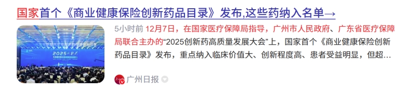 12月7日,在国家医疗保障局指导,广州市人民政府、广东省医疗保障局联合主办的“2025创新药高质量发展大会”上,国家首个《商业健康保险创新药品目录》发布,重点纳入临床价值大、创新程度高、患者受益明显,但超出基本医保保障范围的药品。
