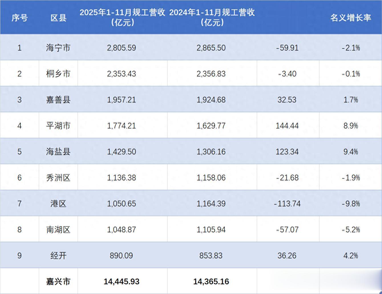 除了海宁和桐乡外,嘉兴其他区县2025年前11月规模以上工业企业营收总额都不足2000亿元。其中嘉善县总量相对较高,累计金额为1957.21亿元, 距离2000亿门槛仅一步之遥,突破已是指日可期!