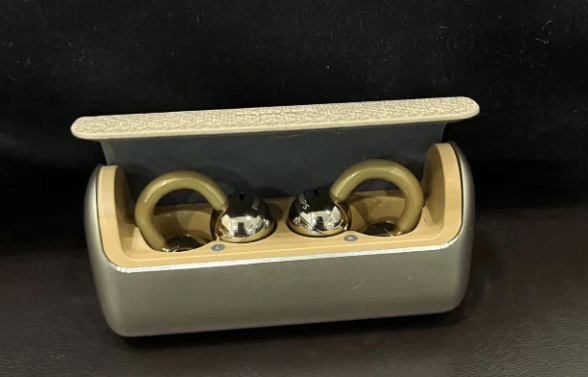 这款耳机在外观设计上注重细节,充电盒外层覆盖科纳皮,触感丝滑。耳机本体采用NCVM工艺处理,呈现出优雅的金属质感。佩戴设计上,0.6mm超纤细柔性记忆钛丝与亲肤液态硅胶结合,符合人体工学,佩戴时柔软舒适且稳固性较好。单耳重量约9.7g,长时间佩戴耳朵可能会有轻微负担。