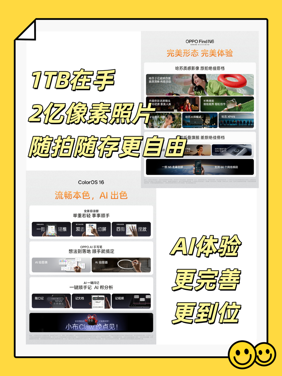 更何况大内存手机用着就是爽,OPPO Find N6一来搭载了哈苏2亿超清四摄,有了1TB在手想怎么拍就怎么拍不怕手机空间爆棚;二来OPPO Find N6还自带很多AI功能,比如即将登场的小布Claw,而1TB版本就能给足AI功能运算空间,AI体验比起小内存版本会更完善到位~