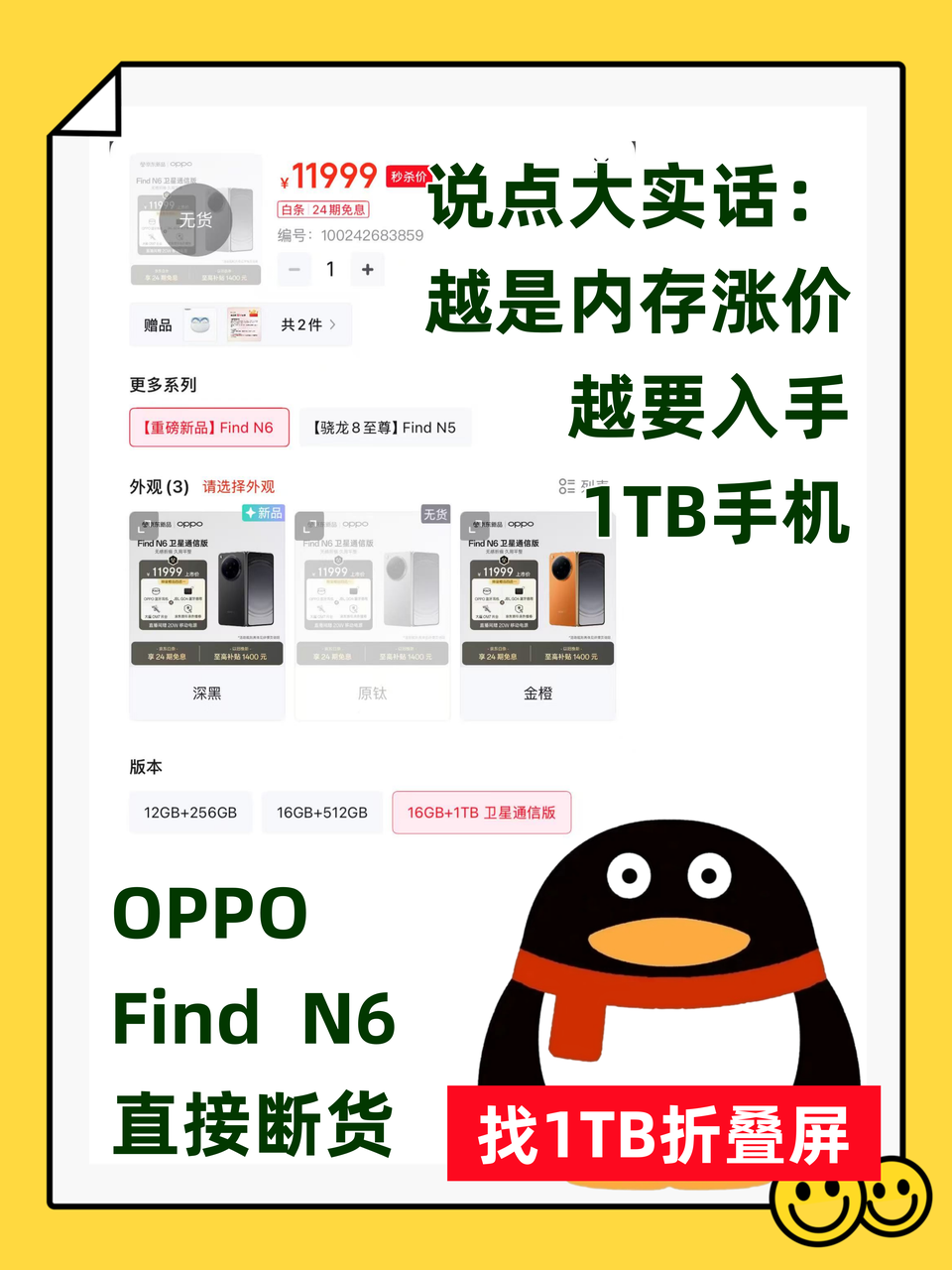 毕竟全面涨价时代,新机越晚发布就越贵,内存越往后就越涨价,这时候不买,到时候说不定同样的价格只能入手256GB了!这也是为什么OPPO Find N6的1TB版本直接卖断货~