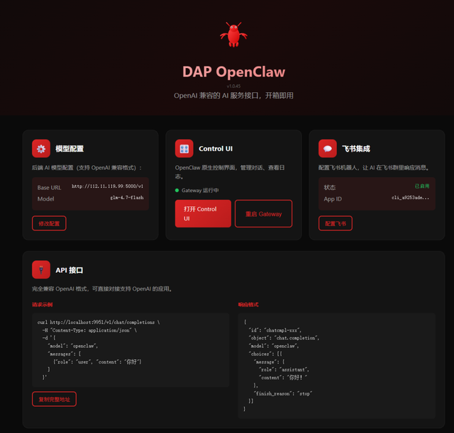 当前DAP OpenClaw稳定版本为v1.0.45,完美适配标准Docker环境,部署流程高效简洁,同时支持数据加密存储、端口自定义、认证Token配置等安全与个性化能力,可广泛满足团队内部AI助手搭建、自有产品AI能力赋能、私有化大模型体验、智能办公协同等多种场景需求,以安全、高效、便捷的特性,助力各类用户零门槛、低成本落地私有AI服务。