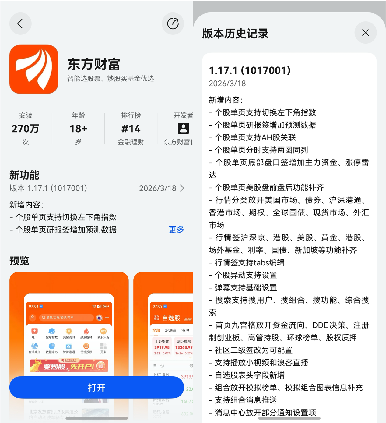 自从将手机升级到鸿蒙6后,除了感觉系统更流畅、更智能之外,最让我惊喜的就是不断上新的鸿蒙应用了,特别是我常用的东方财富,不仅更新速度非常快,而且每次升级都带来了实打实的新功能。前几天就推送了1.17.1新版本,一口气上线了近20项新功能,日常炒股理财变得愈发顺手了。