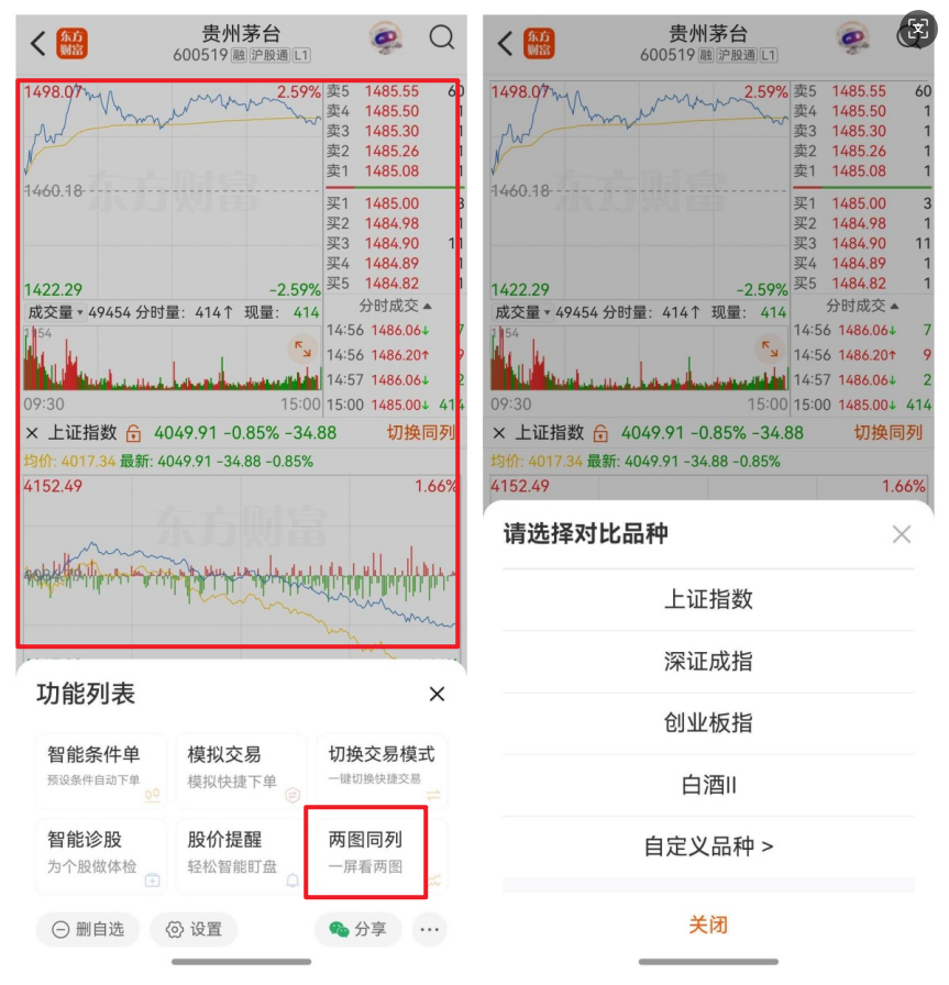 打开新版本的第一感觉,就是个股单页体验明显提升了。分时图现在支持“两图同列”,可以在一屏之内同时对比两个品种的走势,不需要来回切换页面,这个功能对于观察盘面联动非常有帮助。同时,个股左下角的指数也能点击切换,操作方便了不少。