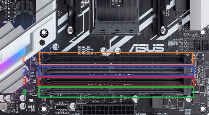此款主板仅支持双通道但提供了4个内存条接口,那么问题来了,怎么插才是双通道?为方便讲解,我为大家标上了号1、2、3、4。可能有的小伙伴会说,管他呢,全部插满总会是双通道了吧,当然,全部插满是组成双通道的一种方式,如果您的四条内存全部都是相同频率、相同容量甚至相同品牌,那么恭喜您,您组成了最优性能的双通道。但当我们只有两条内存时,我们可以选择插入到1、3两个插槽里或者插入到2、4两个插槽里,这两种方案都是可以组成双通道的,那当我们插到1、2插槽里,3、4插槽里和1、4亦或2、3插槽里的时候,只能单纯的增加内存容量,不能扩宽内存的数据宽度,所以,都不算做双通道。
