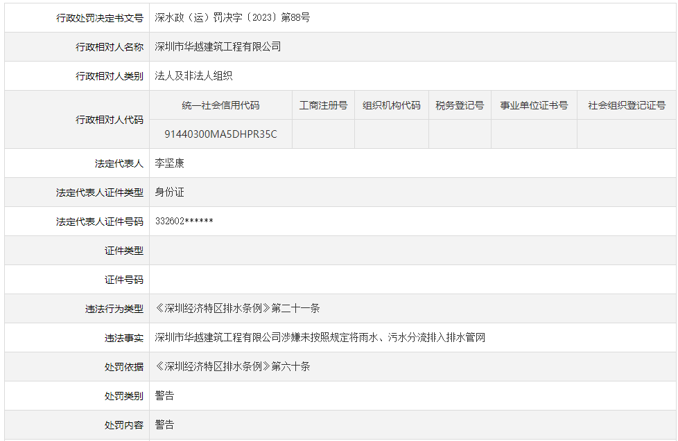 近日,深圳市华越建筑工程有限公司因违反《深圳经济特区排水条例》相关规定,被深圳市水务局处以警告的行政处罚。