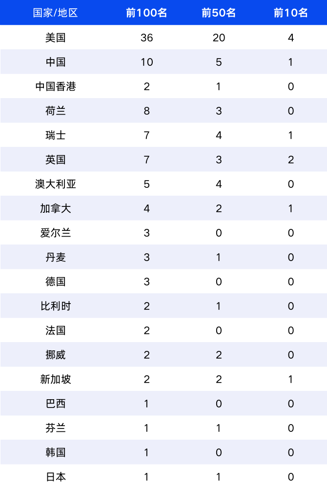 世界排名TOP10大学中,美国大学4所,英国2所,中国、加拿大、瑞士、新加坡各1所。