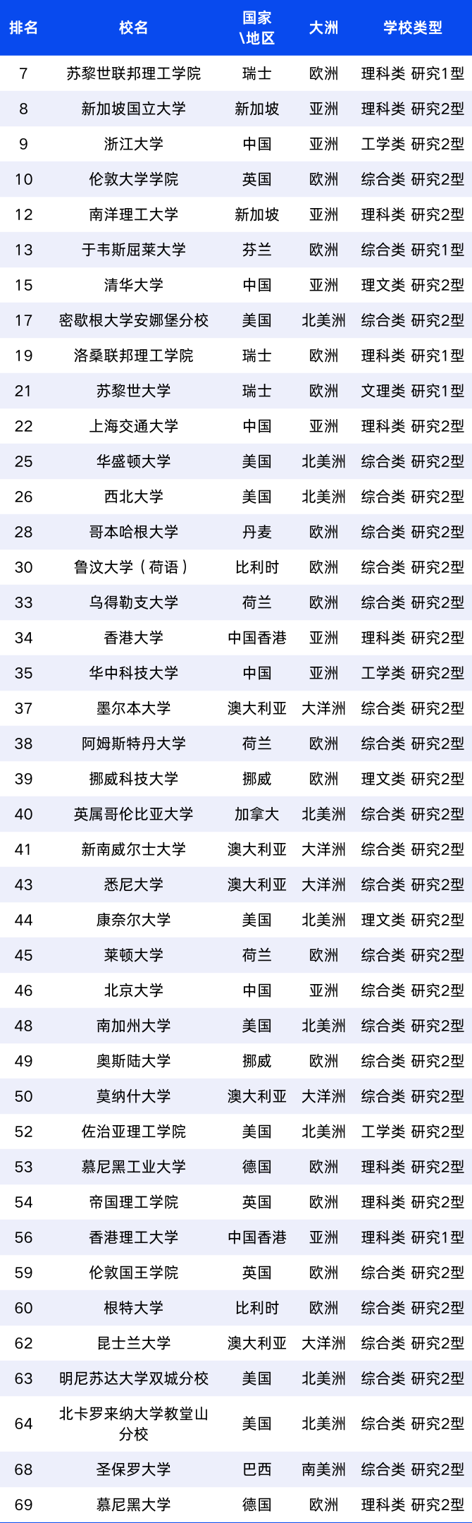 哈佛大学全球第1名,北美洲第一。牛津大学全球第5名,欧洲第一;新加坡国立大学全球第8名,亚洲第一;墨尔本大学(澳大利亚)全球第37名,大洋洲第一;圣保罗大学(巴西)全球第68名,南美洲第一;开罗大学(埃及)全球第471名,非洲第一。