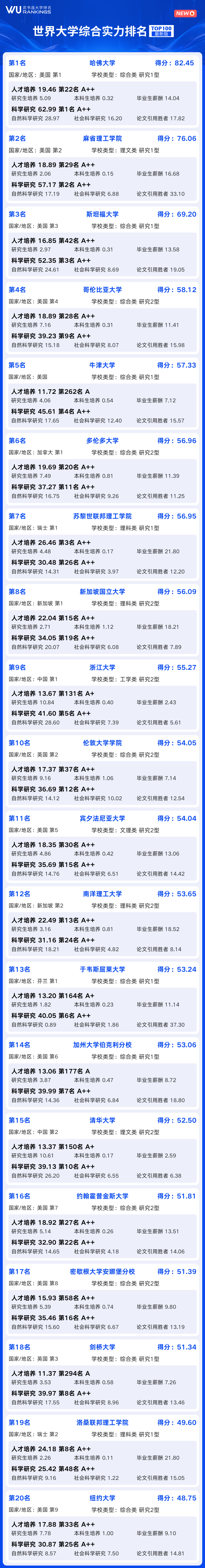 世界大学综合实力100强