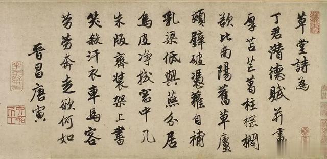 唐寅《为丁潜德赋草堂诗》行书,大英博物馆藏。正德十五年庚辰(1520年)唐寅51岁时,为晋陵丁潜德画《西山草堂图》。它描绘了暮色朦胧中的山水风光。河岸青山连绵起伏。在画面前方,一位学者坐在他的乡村小屋里,享受着乡村隐居生活。打开手卷,可以看到更多的山水景色。将手卷展开,从左方一弯水路映入眼帘。