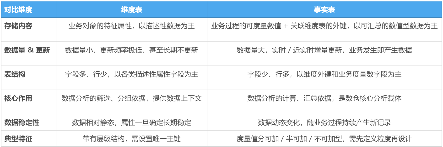 数据特征:数据量小、更新频率极低,甚至长期不更新。比如产品的基础属性、地域的层级信息,一旦确定就不会轻易变动,数仓中维度表的行数通常远少于事实表。