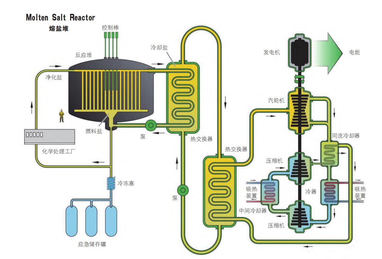 而熔盐堆,则是直接把燃料溶解在熔融的氟盐混合物中,后者在400-700℃时呈液态,因此被称为“熔盐”。熔盐既是燃料的“载体”,又是冷却剂和热传输介质。它能在高温下运行,却只需接近常压,避免了高压容器带来的复杂性和风险。