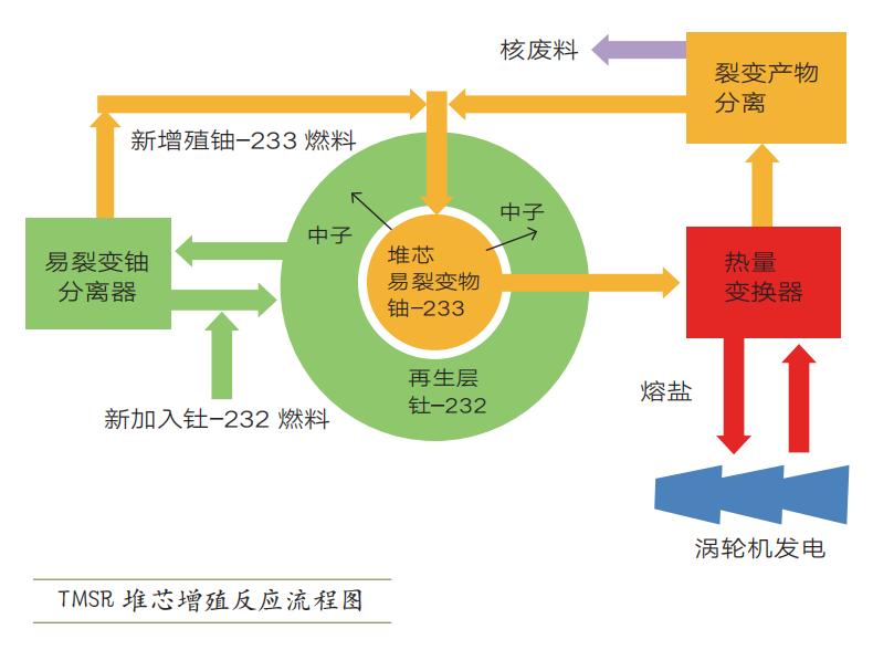 现有的核反应堆,原料都是放射性的铀-235。而在钍基核反应堆中,原料是钍-232。在反应堆中,钍-232可以吸收一个中子变成镤-233,再经过两次β衰变,转化为铀-233。铀-233本身既可以裂变发电,也能释放中子继续促进钍-232的转化,循环往复,这就是所谓的链式反应。