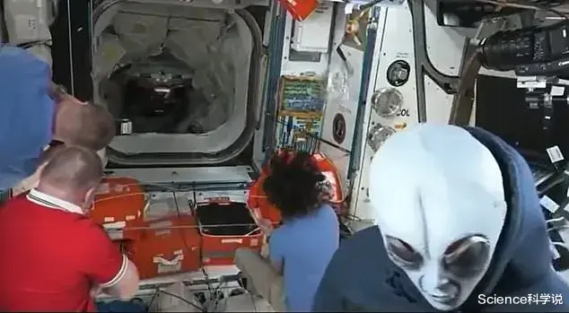 国际空间站的摄像头记录下荒诞一幕:NASA宇航员尼克·黑格戴着绿色外星人面具,在零重力环境中张开双臂。