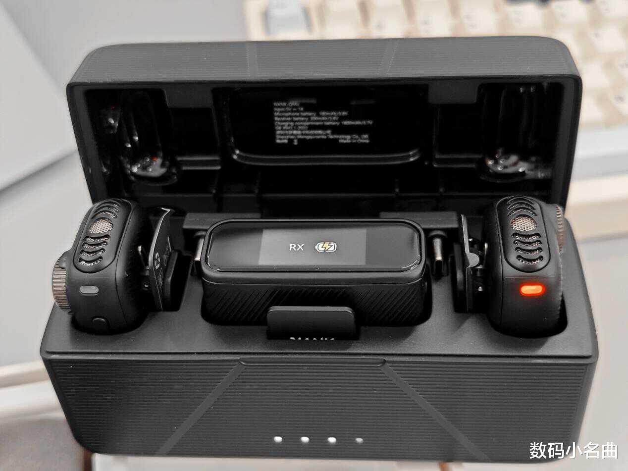 接收器的设计也让我惊喜。它采用了横向长条的造型,正面是一块1.2英寸的触控屏,亮度足够高,即使在户外也能清楚显示。比起传统的麦克风需要盲操作,Qmic的触控屏可以直接点选,操作起来简单明了。它还带有一个3.5mm耳机接口,能够连接监听耳机,兼顾了充电和传输的功能,设计非常简洁,放口袋里也不占地方。