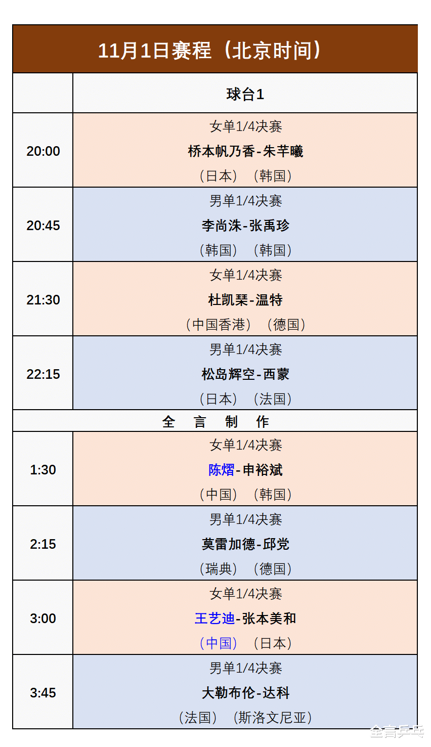 紧接着北京时间11月2日凌晨将结束剩下的4场单打1/4决赛,国乒运动员也将亮相,详细安排为: