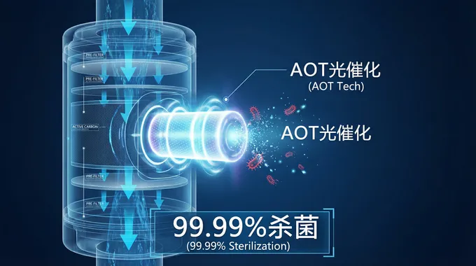 在“无菌”二字背后,是硬核科技的支撑。不同于市面上大多数净水器的“物理拦截”,虎鲸妈妈引入了AOT光催化氧化技术。这是一种主动出击的杀菌策略,杀菌率高达99.99%。