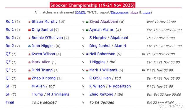 利雅得斯诺克锦标赛最新签表赛程,冲击金球167满分杆,赵心童有望再战火箭,丁俊晖欲斗希金斯