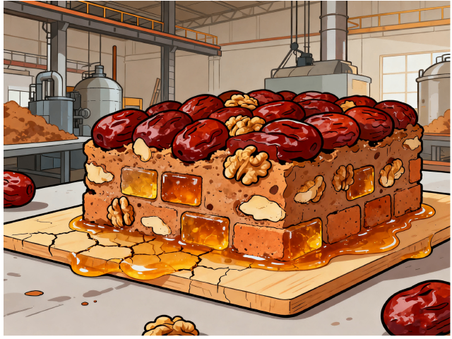 红枣化作绵密的地基岩层,核桃仁如琥珀砖块镶嵌其中,麦芽糖浆充当天然水泥,在低温烘烤中凝固成,带着自然裂纹的琥珀画板。