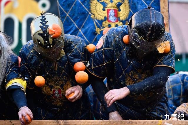 每年2月底3月初,意大利北部小镇伊夫雷亚都会上演一场真实的橙子大战。700到900吨橙子,好几千人参加战斗, 连砸三天。