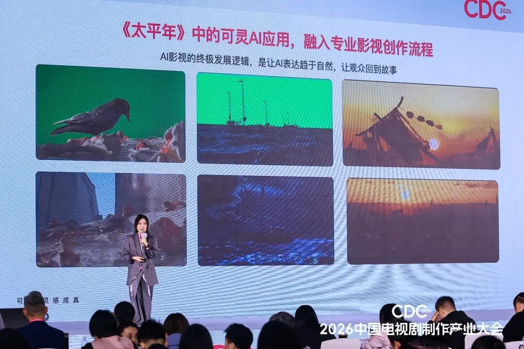 可灵AI创作者及行业运营负责人王若暄现场分享了在开年大剧《太平年》中的实践,非常出圈的“乌鸦啄腐肉”特效镜头就是AI做的。
